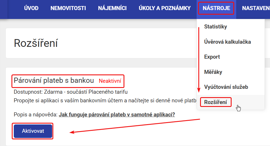 Aktivaci funkce Párování plateb s bankou naleznete v Nástroje → Rozšíření → Párování plateb s bankou → Aktivovat.