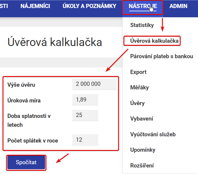 Po kliknutí na Úvěrová kalkulačka se vám zobrazí tabulka pro doplnění základních údajů o vašem úvěru. Zadáte výši úvěru, úrokovou míru, dobu splatnosti v letech a počet splátek v roce. Zadání potvrdíte tlačítkem Spočítat.