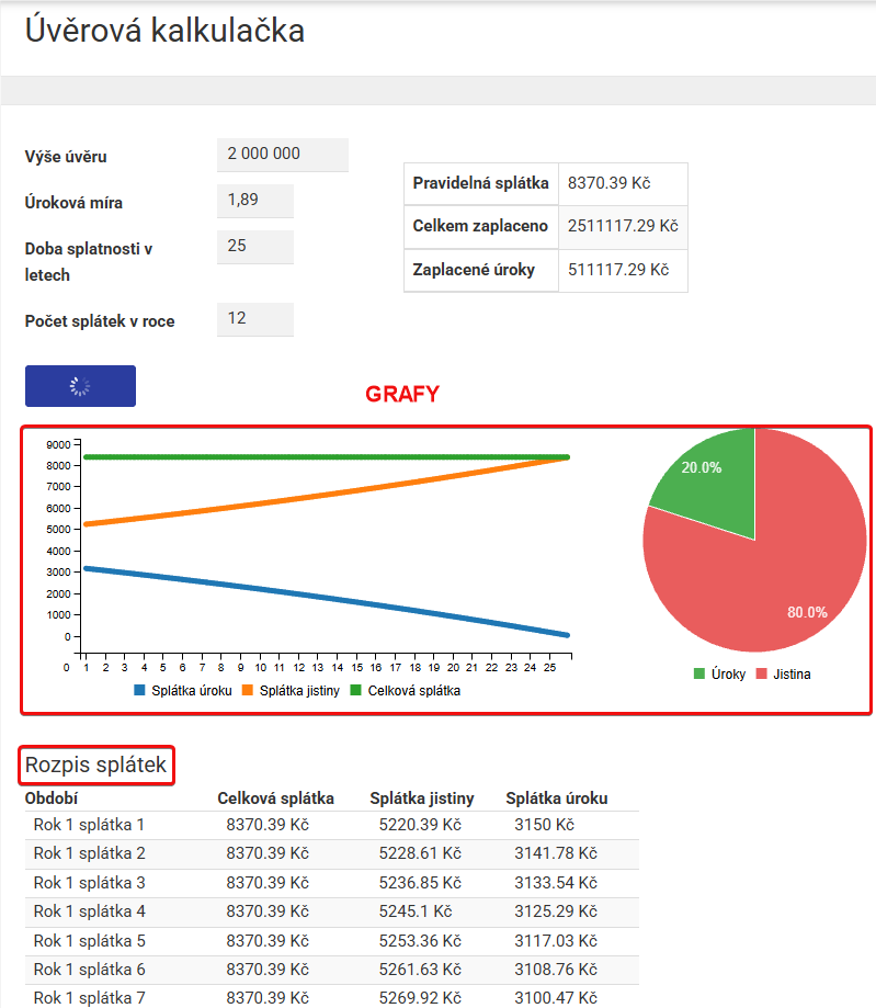 Zobrazí se vám přehledný graf a podrobná tabulka s vývojem splátek a umořování úvěru.