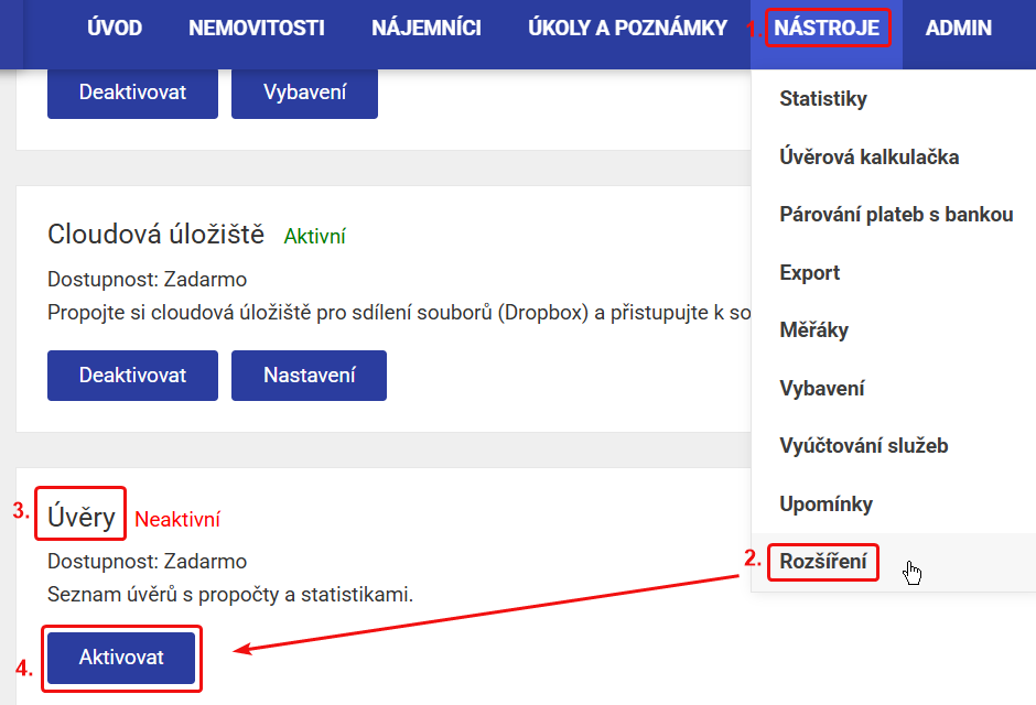 Modul Úvěry je potřeba nejdříve aktivovat: