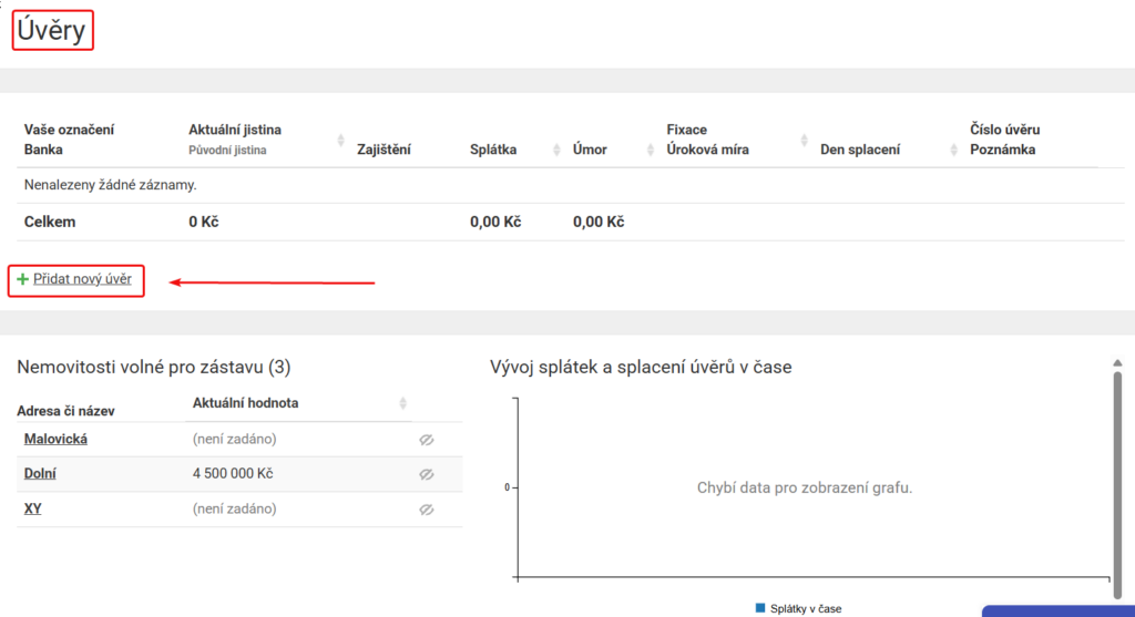 Po aktivaci modulu se zobrazí stránka Úvěry, kde je souhrnný seznam úvěrů, seznam nemovitostí volných pro možnou zástavu a graf vývoje splátek a splacení úvěrů v čase.