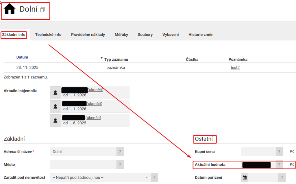 Aktuální hodnota se zadává na stránce konkrétní Nemovitosti v záložce Základní info.
