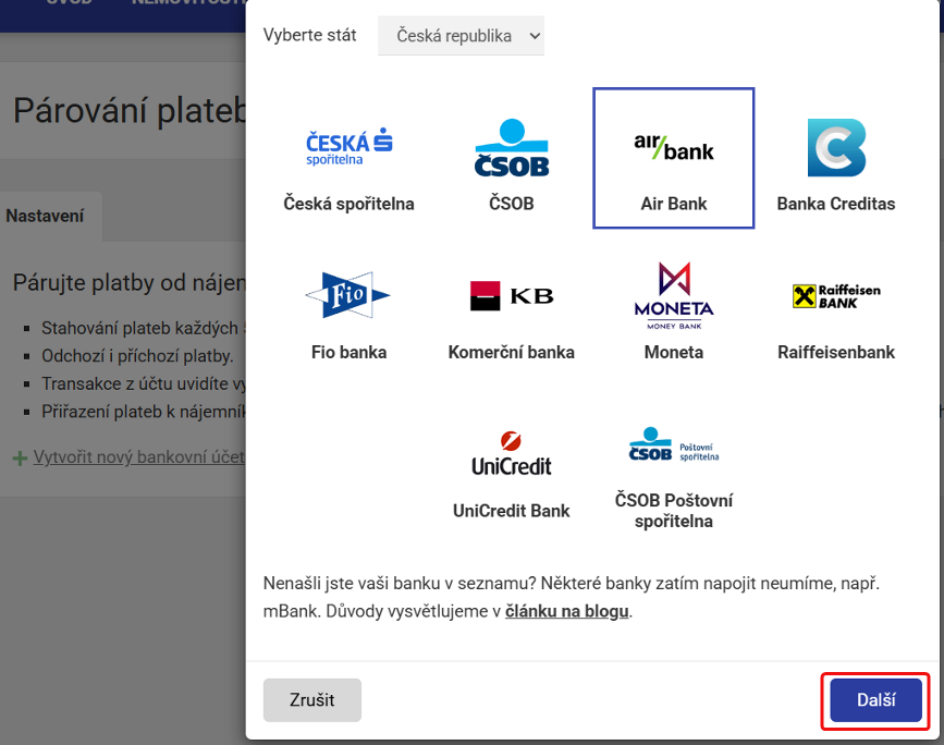 Pro párování plateb doporučujeme používat samostatný bankovní účet určený pouze pro příjem nájmů. Díky tomu můžete účet bez obav napojit na systém a zajistíte, že se budou platby správně propisovat.