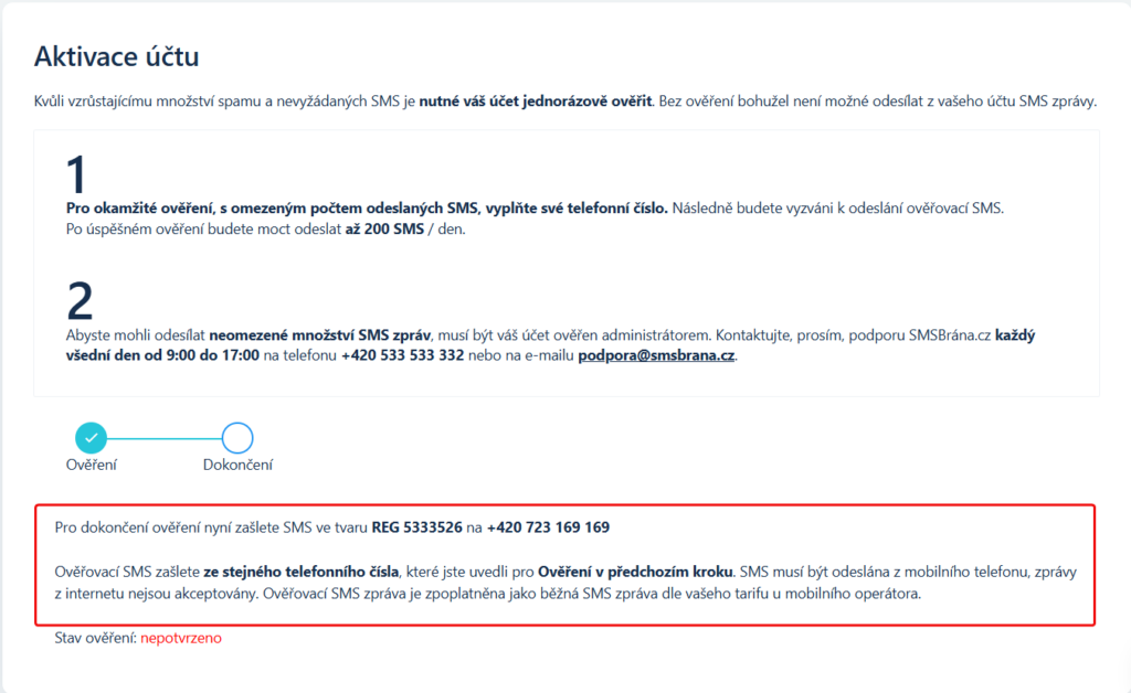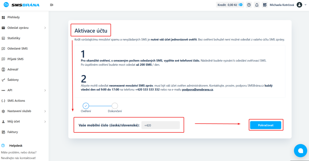 Po prvním přihlášení je potřeba aktivovat účet jednorázovým ověřením Vašeho telefonního čísla. Zadáte své mobilní číslo a podle pokynů odešlete ověřovací SMS ze svého telefonu.