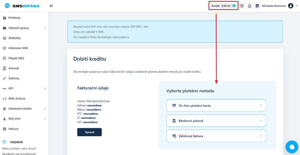 Kredit dobijete přes tlačítko Kredit v horní liště, kde zvolíte platební metodu: