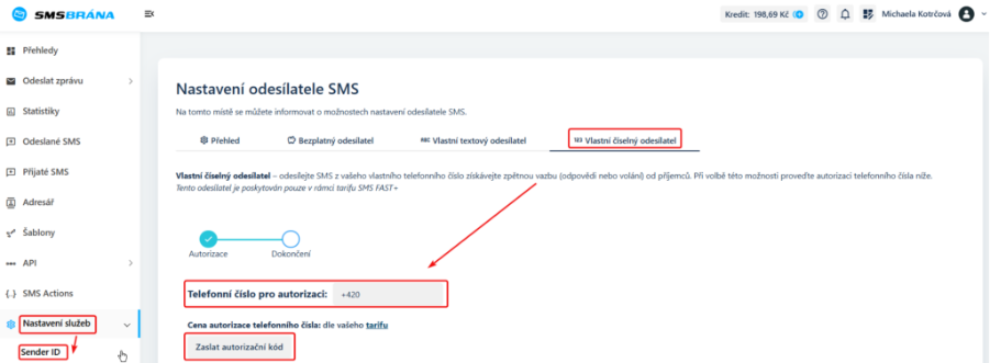 Než bude tarif aktivován, nastavíte si vlastní telefonní číslo, ze kterého se budou zprávy odesílat. V menu přejdete do části Nastavení služeb → Sender ID → Vlastní číselný odesílatel. Zde své telefonní číslo autorizujete.