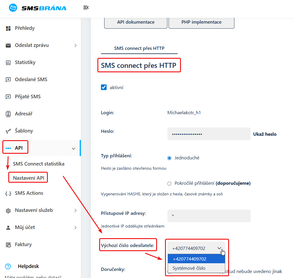 Poté přejdete do části API → Nastavení API → SMS connect přes HTTP. V poli Výchozí číslo odesílatele vyberete své autorizované telefonní číslo.