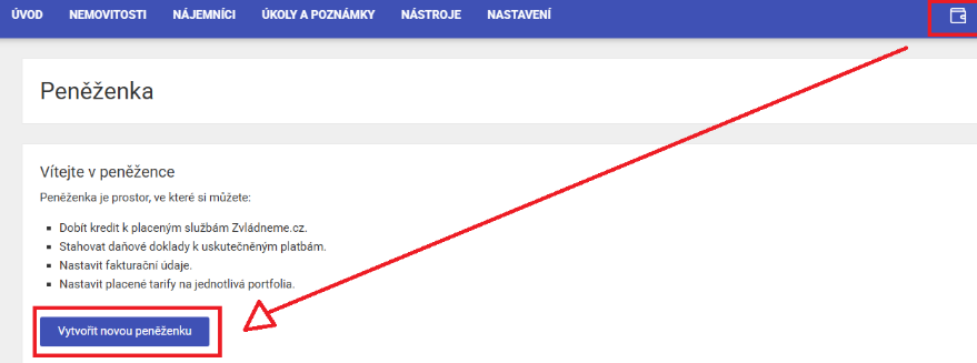 Peněženku najdete v hlavním menu pod ikonou peněženky.