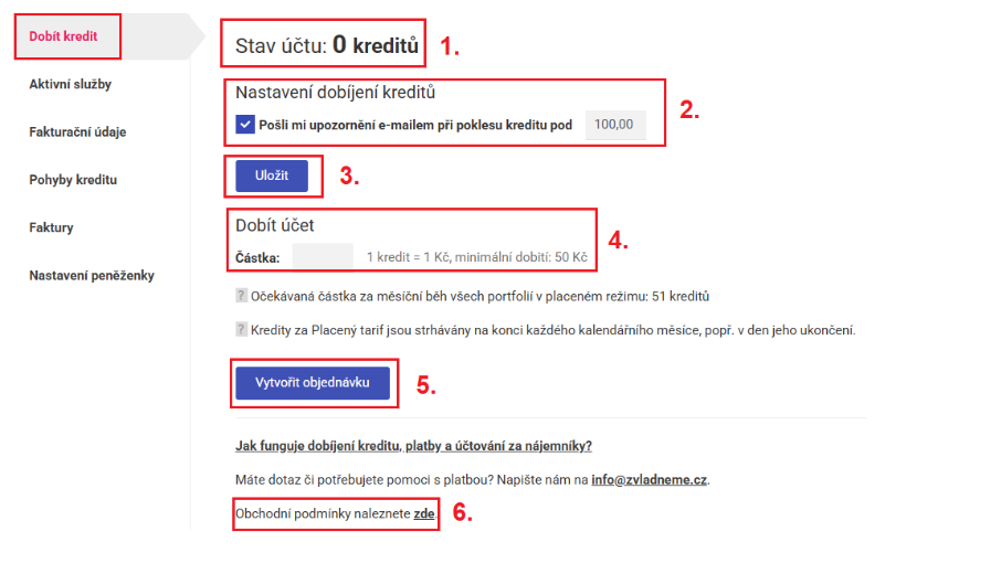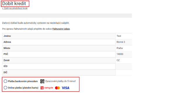 Kredit je přepočítáván v poměru: 1 kredit = 1 Kč.